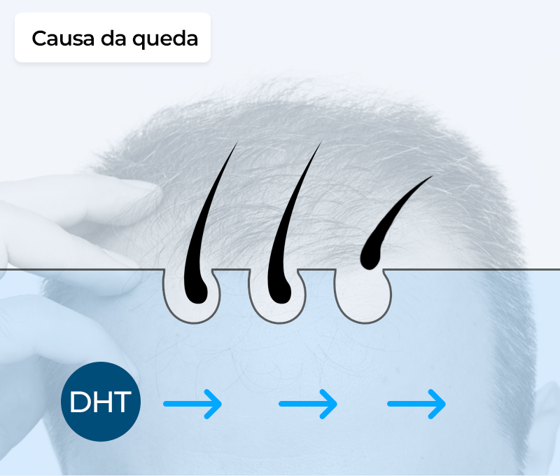 O DHT, um hormônio masculino, age no couro cabeludo enfraquecendo os fios e, assim, causando calvície.